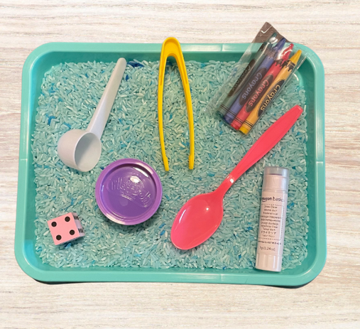 • Includes crayons, scoop, tweezers, dice, glue stick, playdough.